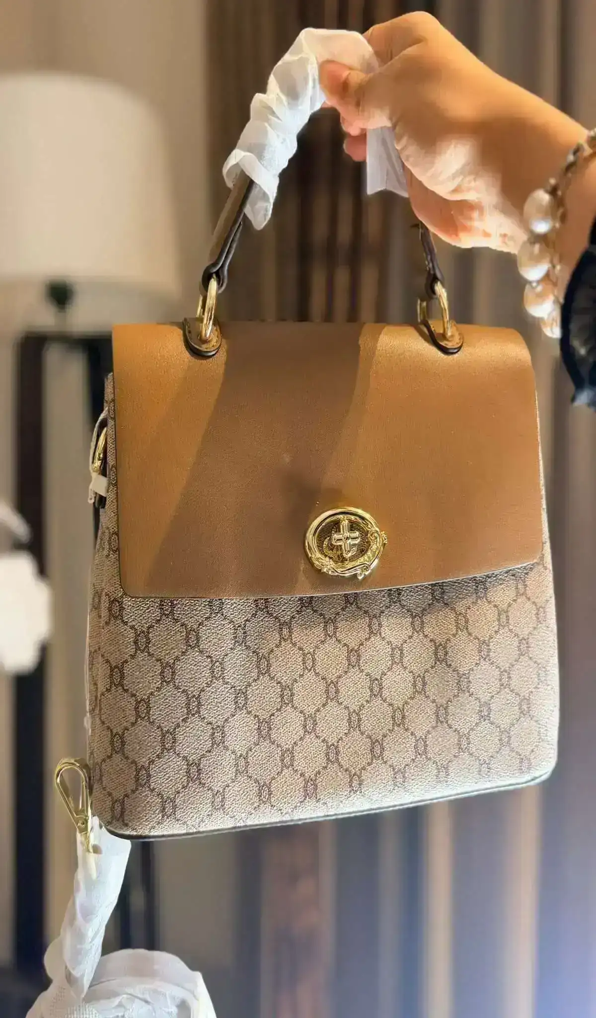 Timeless design meets everyday elegance — the Vintage Luxe Monogram Handbag is crafted with a classic patterned body and smooth leather flap. The structured shape, gold-tone lock detail, and comfortable top handle make it perfect for both casual and formal looks. Carry it to elevate your style effortlessly wherever you go.
